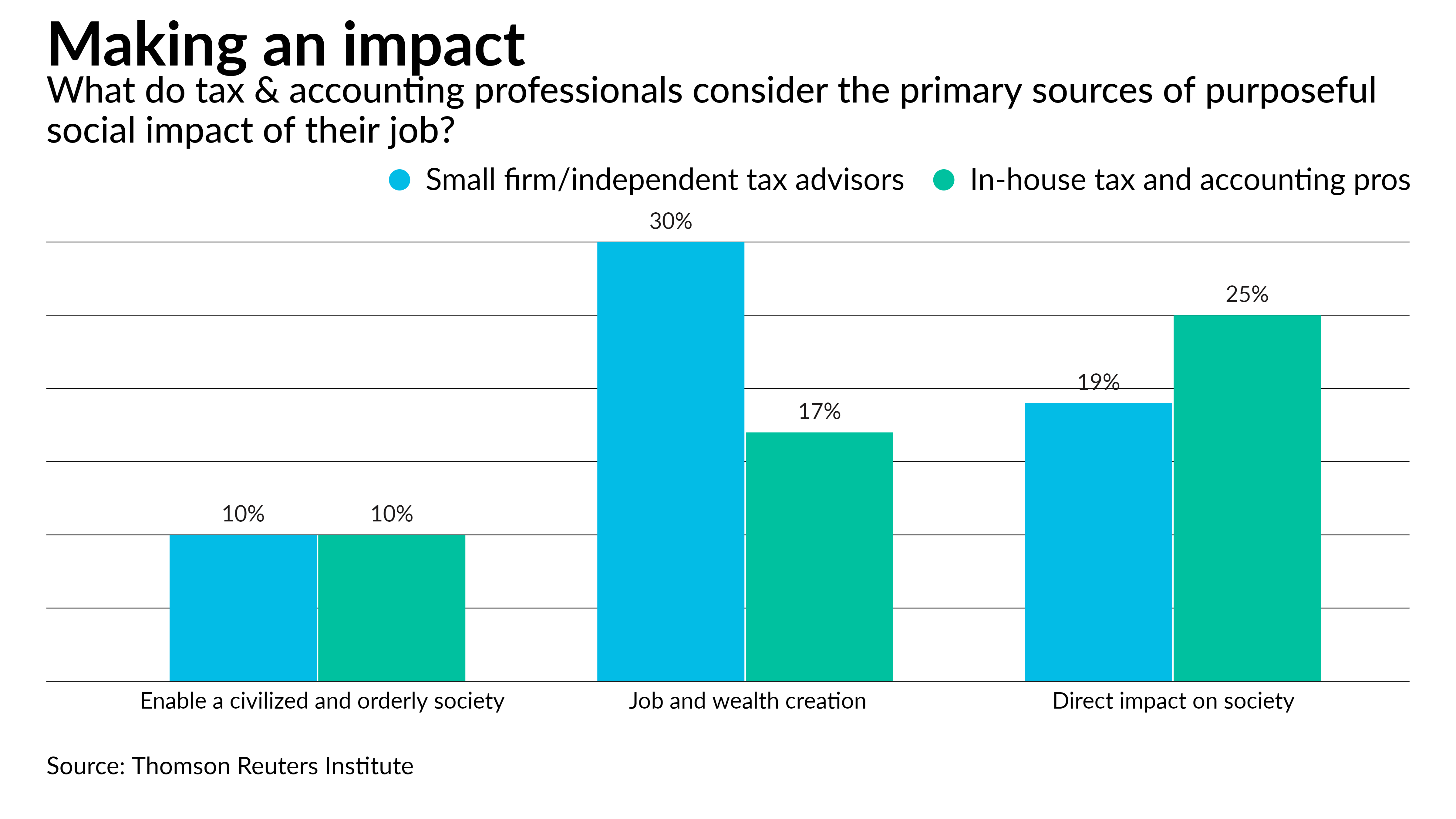 When they were asked, “What do tax and accounting professionals consider the primary sources of purposeful social impact of their job?” 30% of the small firm and independent tax advisors cited job wealth and creation, while 25% of the in-house tax and accounting pros surveyed pointed to having a direct impact on society.